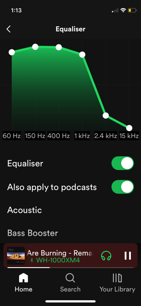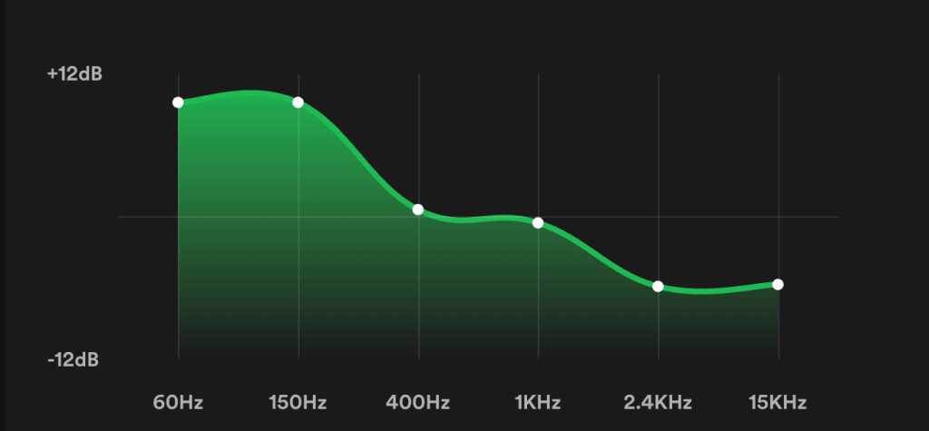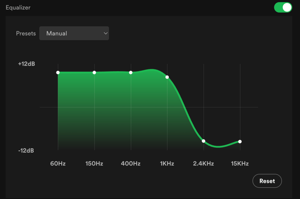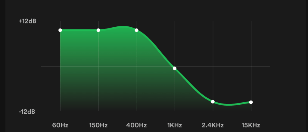 You can see my hearing loss is everything below 1kHz. This means I need to boost everything below 1khz in Spotify, like this: